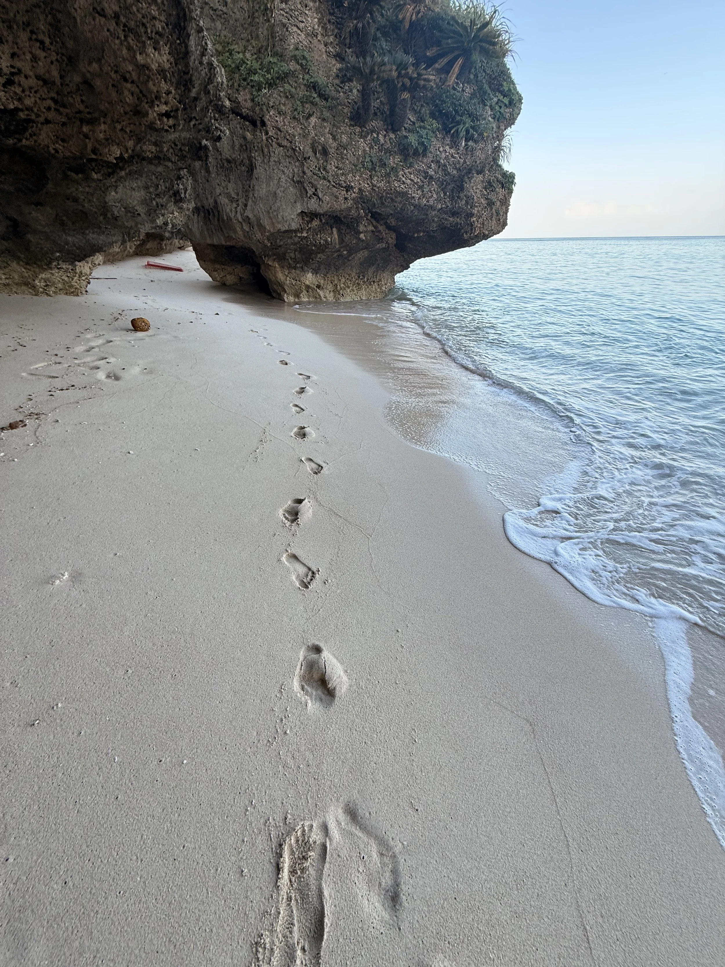 朝の砂浜は静かだった。早朝ヨガのレッスンの声くらいしか聞こえてこない。あとは波音に消される。人の少ない砂浜の端まで行くと、波打ち際の岩がえぐれていて、さらに奥まで路がある。潮が満ちたら戻れない。もうすぐご飯が炊ける。浜の先に進むのは次に残しておく。