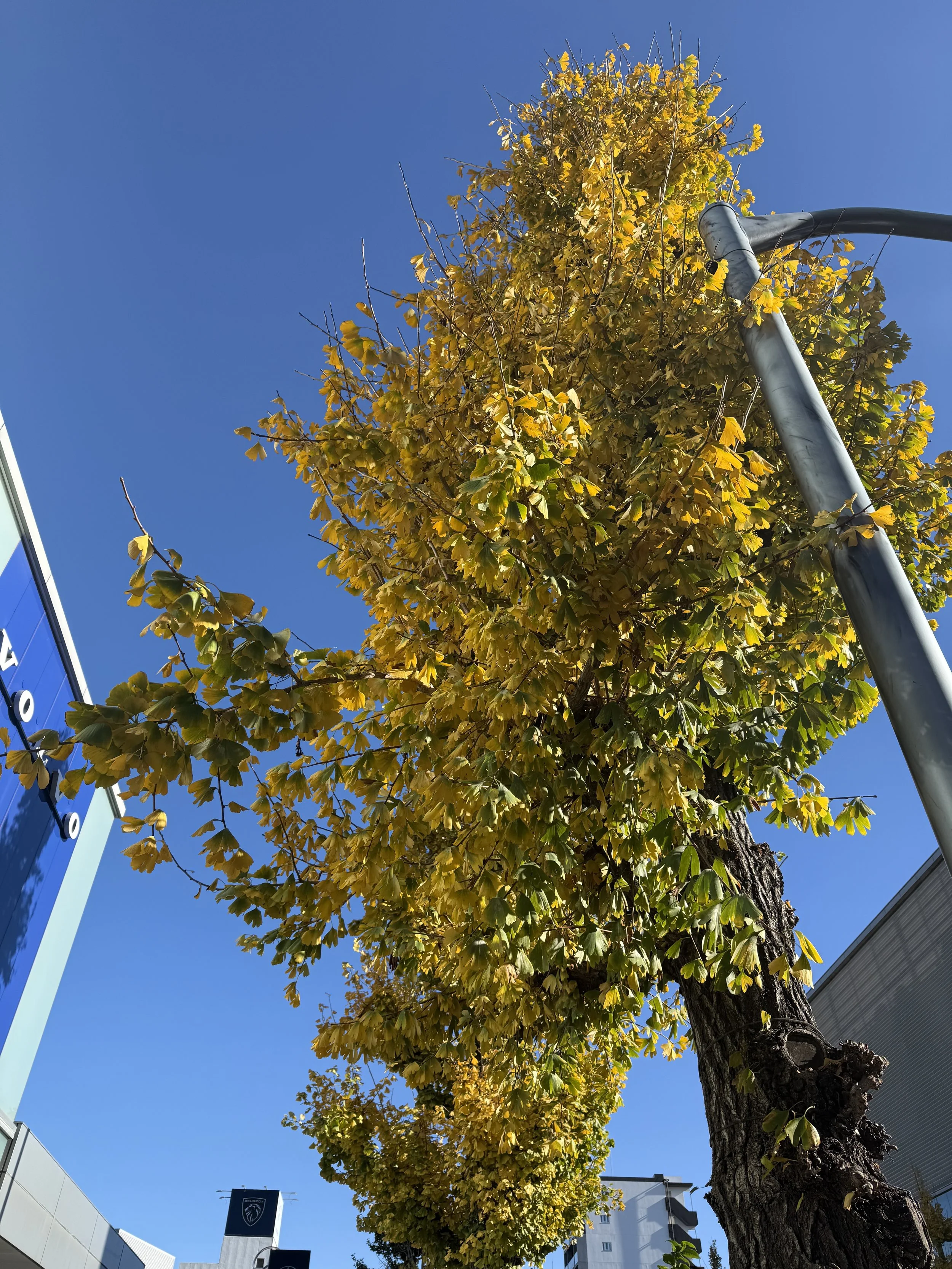 黄色く染まった銀杏の葉。青空には雲ひとつない。水たまりには、昨日降った雨が残る。キラキラと一年を通じて全てが一番綺麗に反射する。